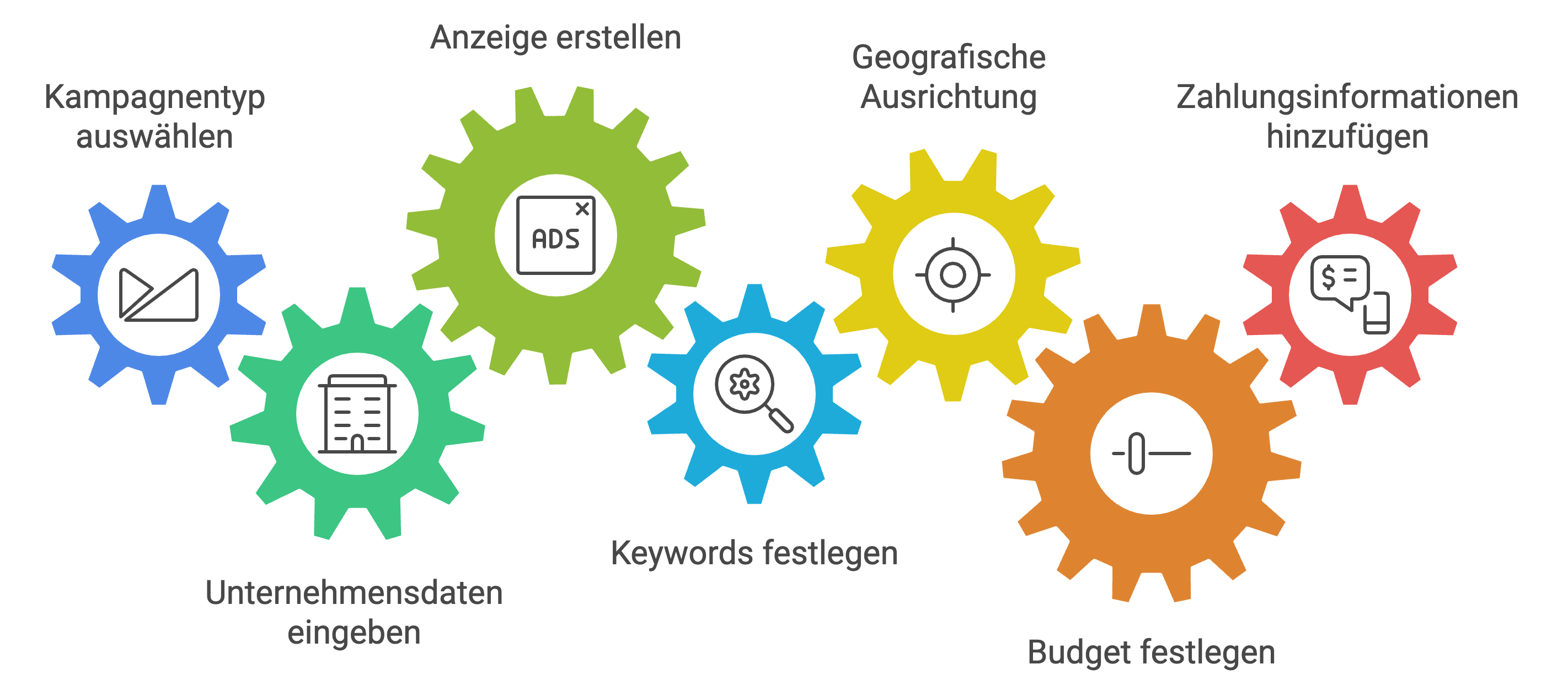| Wichtige Schritte | Konto anlegen – Kampagne einrichten – Anzeige erstellen – Budget festlegen – optimieren |