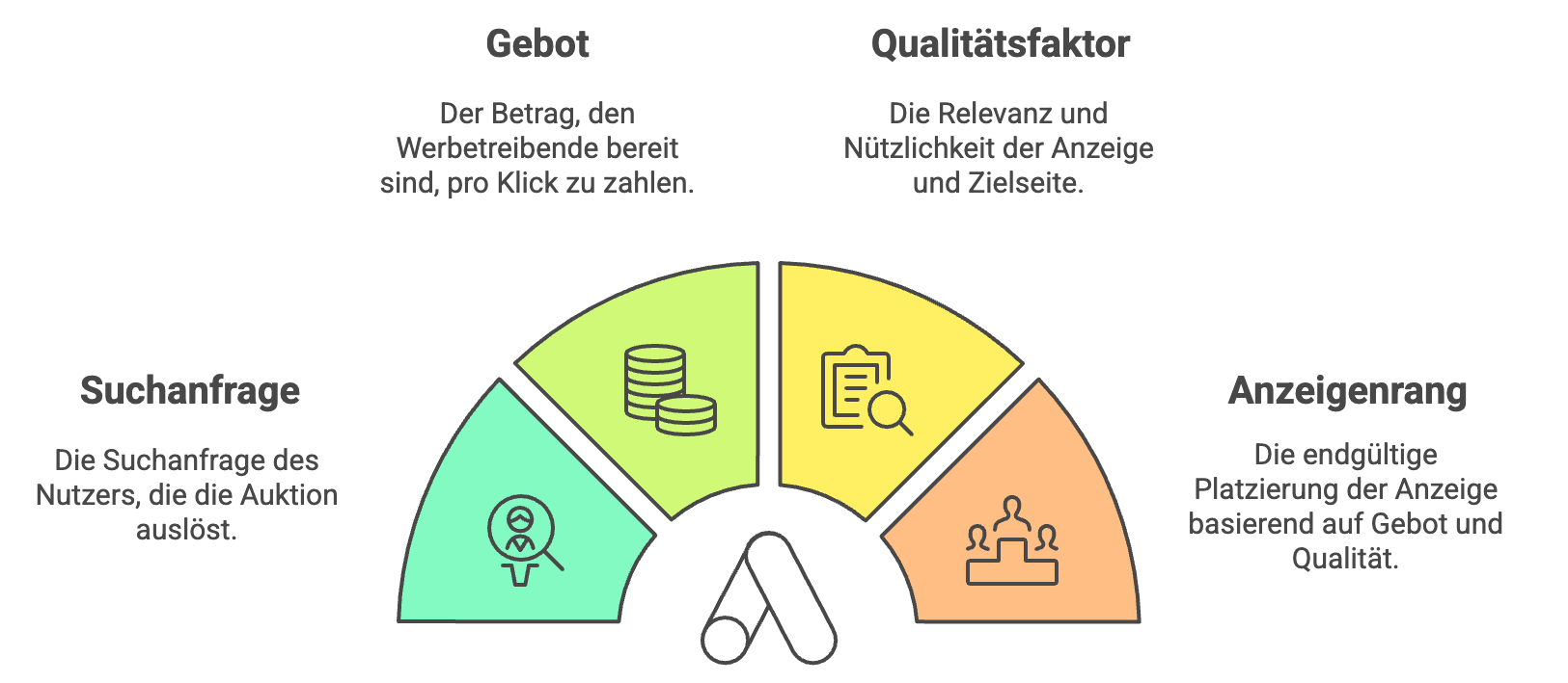 Der Anzeigenrang ergibt sich aus Gebot × Qualitätsfaktor. Er bestimmt, ob Ihre Anzeige oben oder weiter unten auf der Seite erscheint.