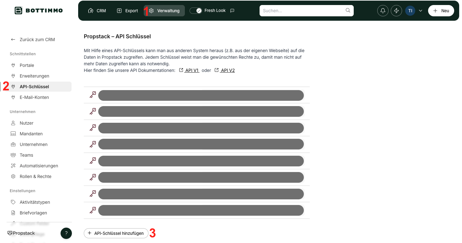 To connect the two systems and ensure secure data transfer, first create an API key by opening your Propstack at the following page: https://crm.propstack.de/app/admin/api_keys